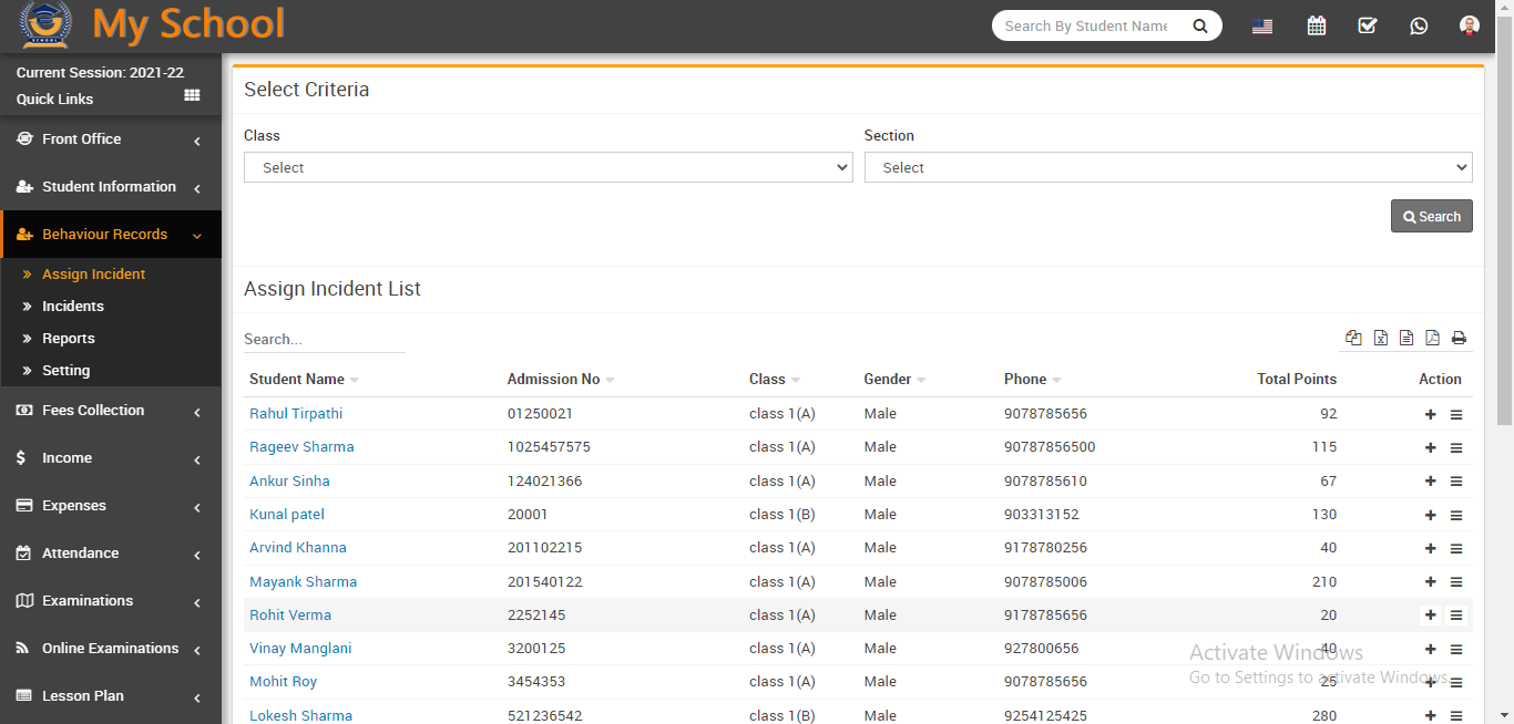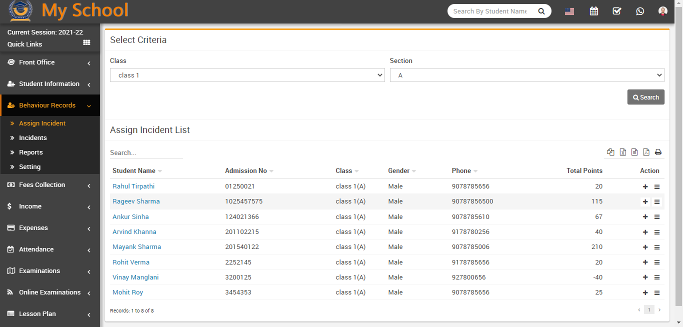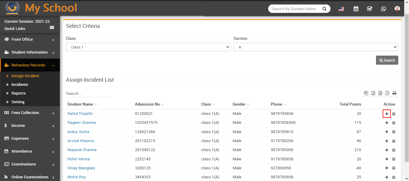 The assign incident list has seven columns: the first column contains the student name list that you searched using the above criteria; the second column contains the student admission number; the third column contains the student's class and section; the fourth and fifth columns contain the student's gender and phone number; and the sixth column contains the student's positive and negative total points.