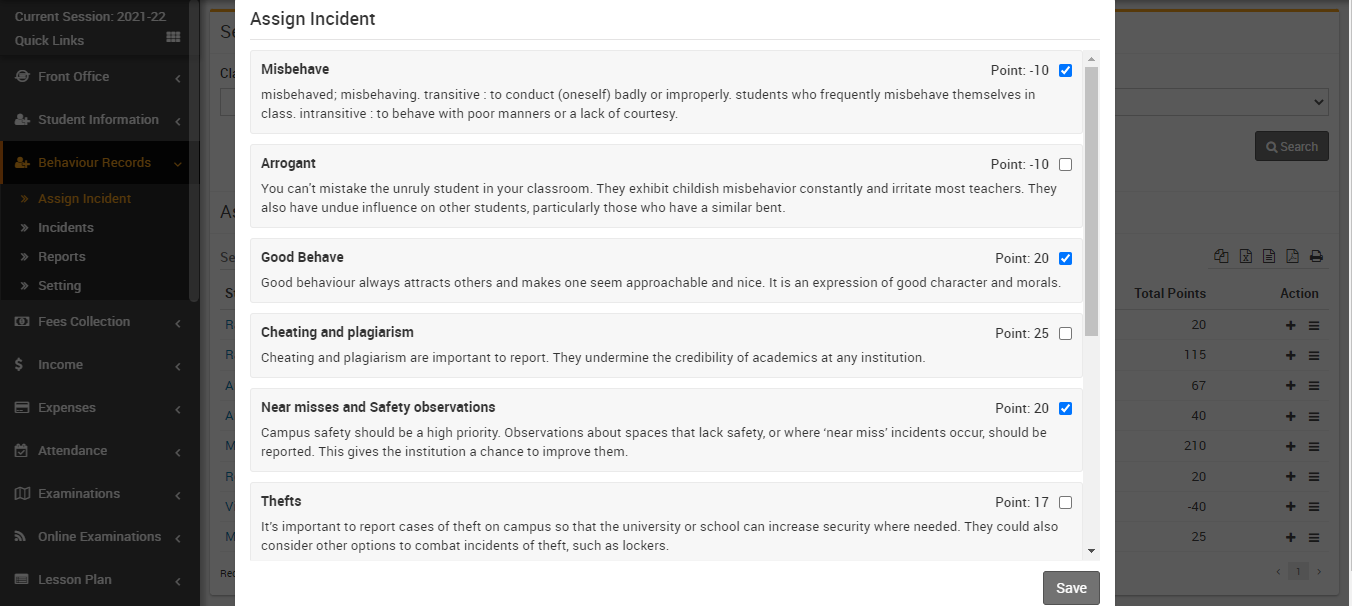 Now click on save button which showing in left bottom corner. By click on save button, incident and points are assign to the student.