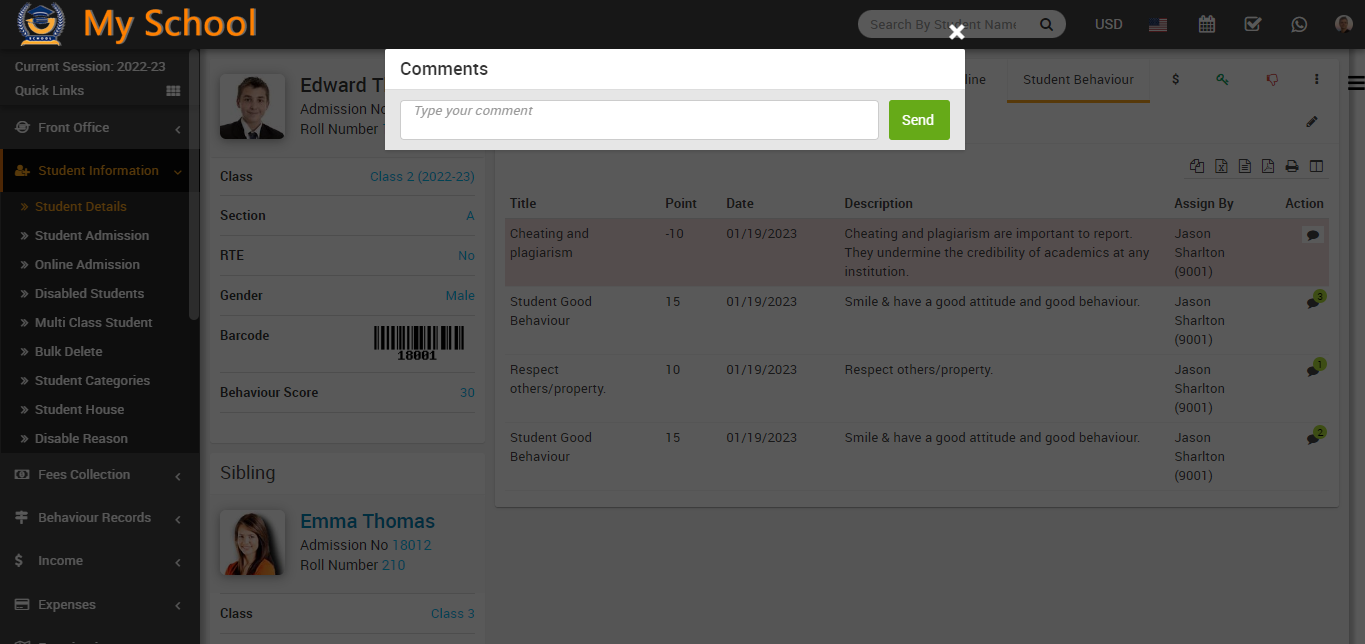 In the incident of student behaviour list showing in the student profile, you can see all the details showing in this table, and now in the action column, you can see the comment option available.