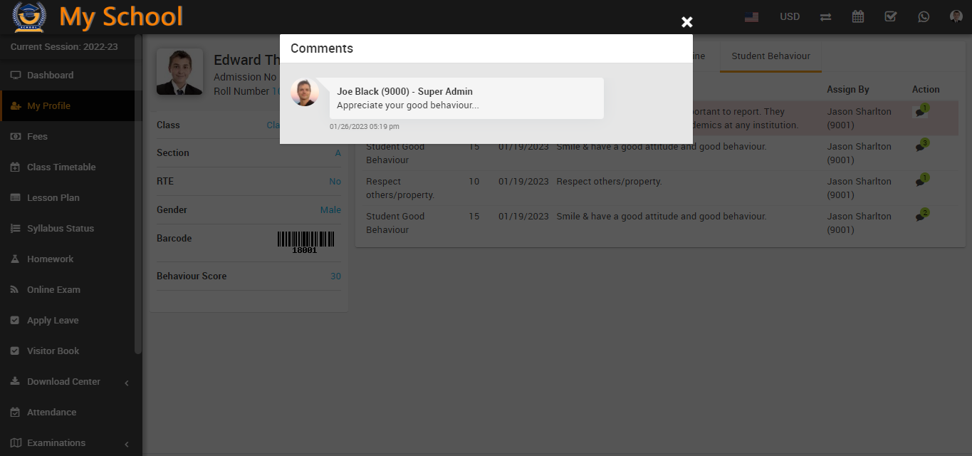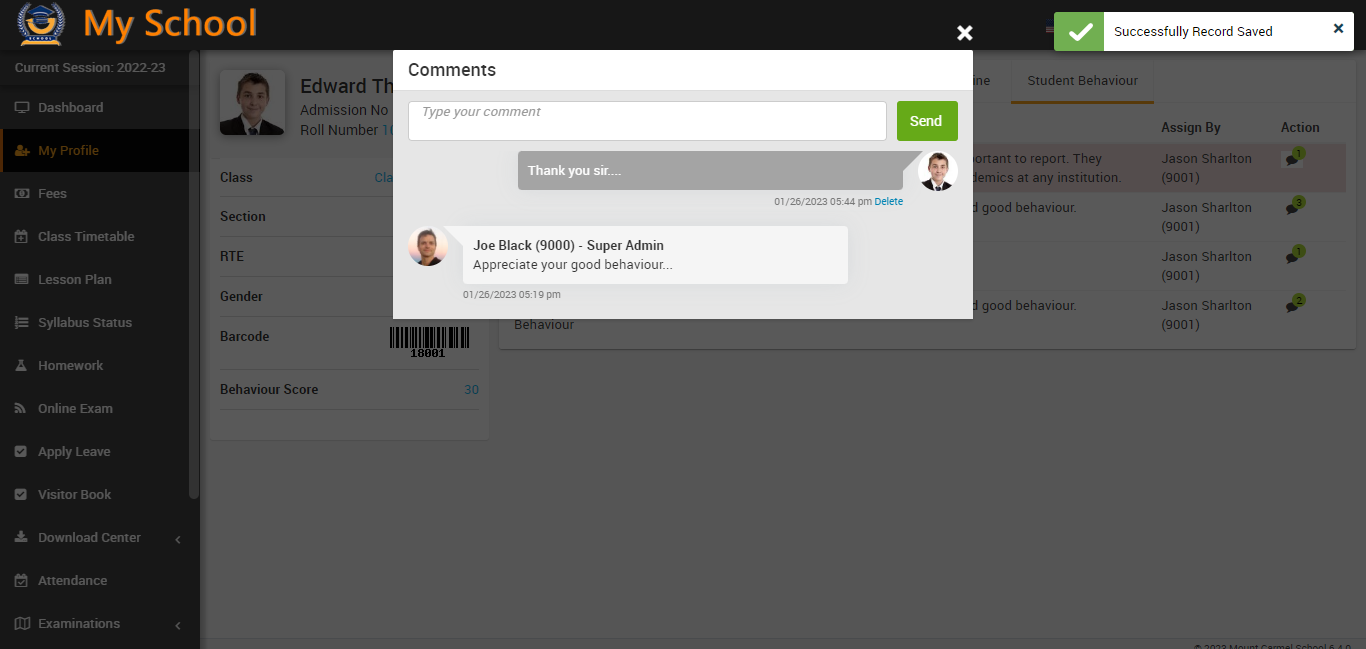 In the student behaviour tab, you can see all the details related to the incident now, in this table, you can see the action column in this action column, you can see the comment option available, and here, students can see the comment on the incident that was left by the superadmin or staff.