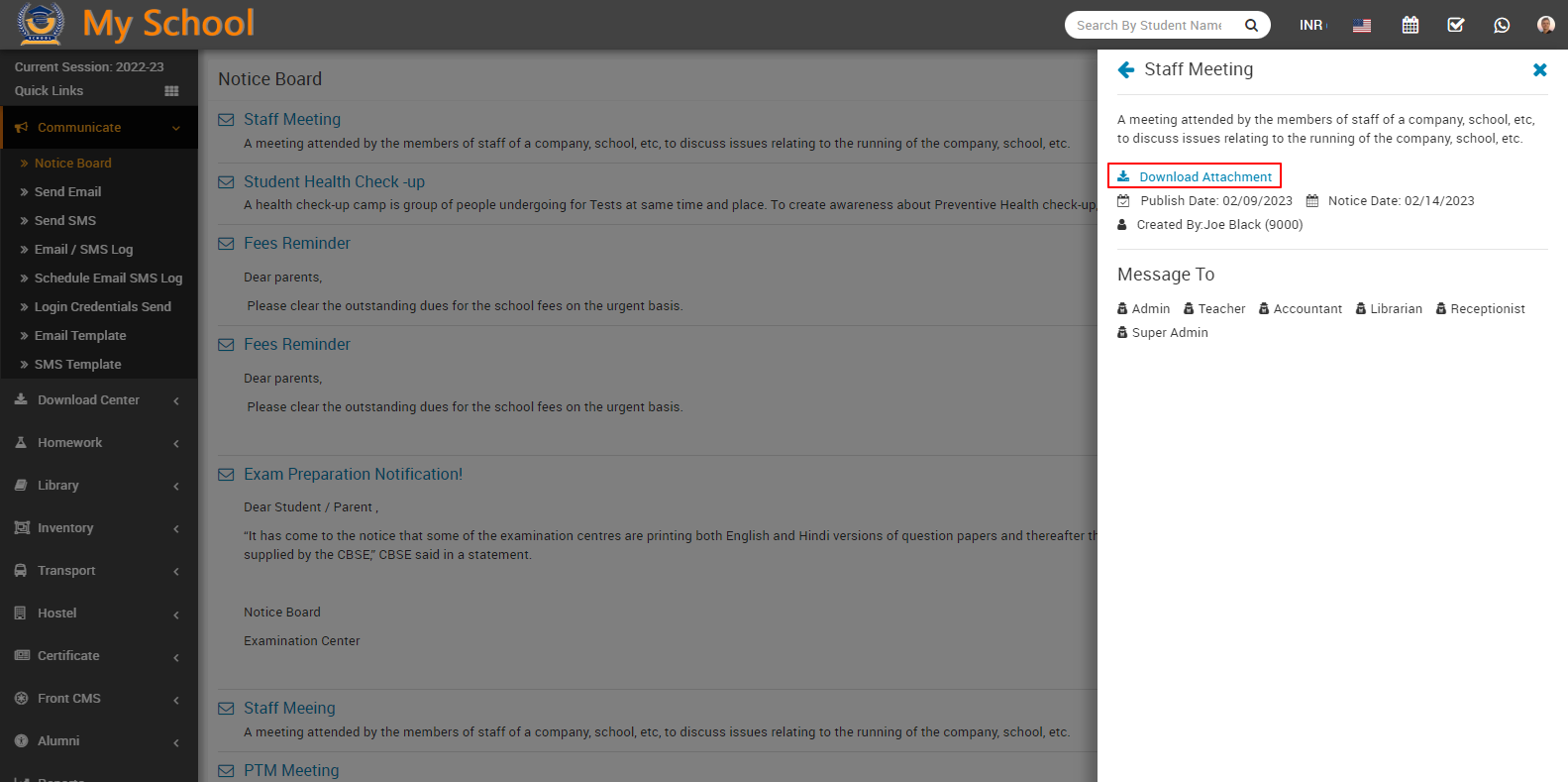 If you want to see the file that you uploaded as an attachment, go to the notice board and click on the message that you sent; the model page will open from the right side; here you can see the download attachment with the download icon; by clicking on this, you can download the file that you uploaded in the post-new message.