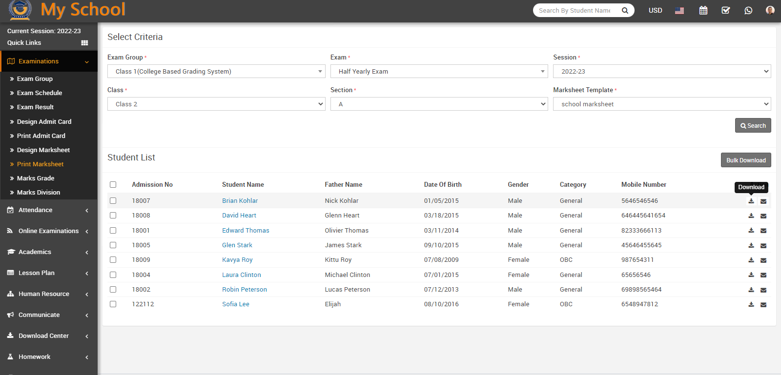 Here you can download the marksheet for an individual student or in bulk. To download the marksheet for a specific student, go to the Action column and click on the Download icon. The marksheet for that student will be downloaded to your system.