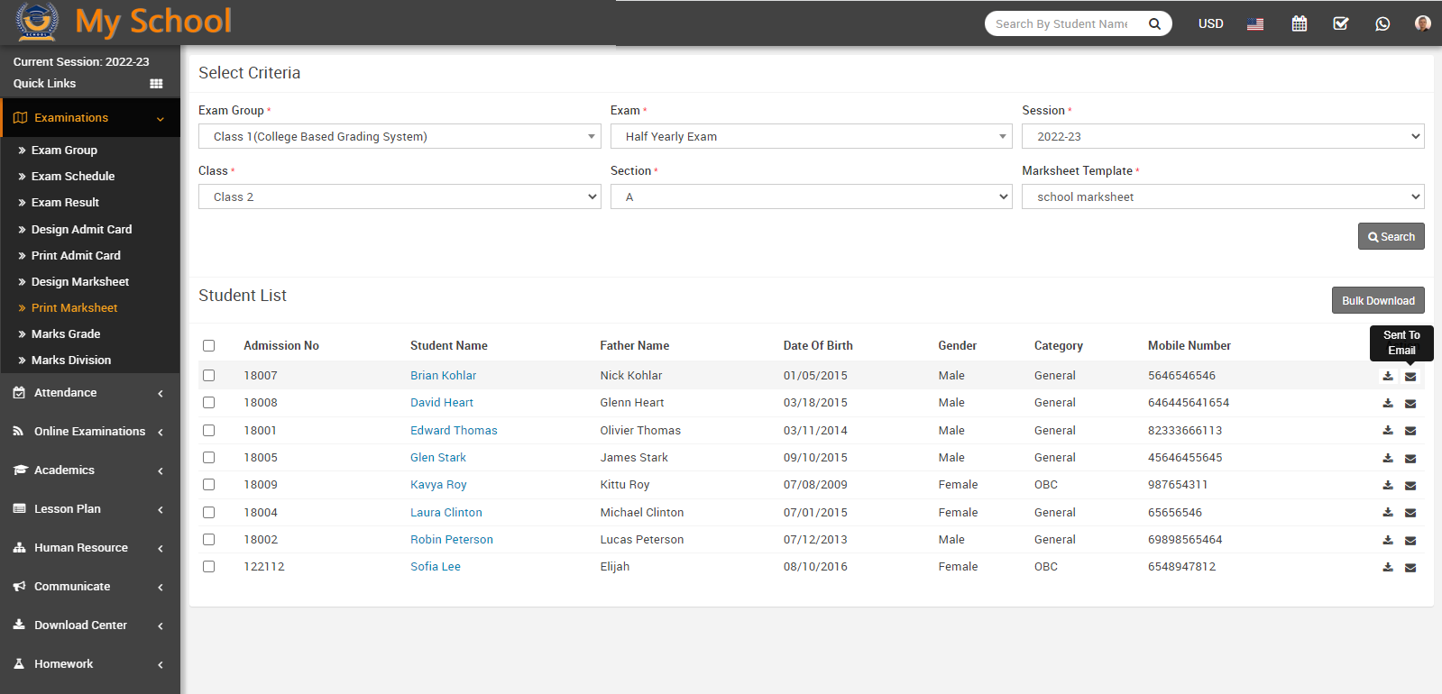 To download multiple marksheets, check the multiple or all checkboxes and click on the Bulk Download button, which is located right above the student list. This will download a bulk marksheet into your system.