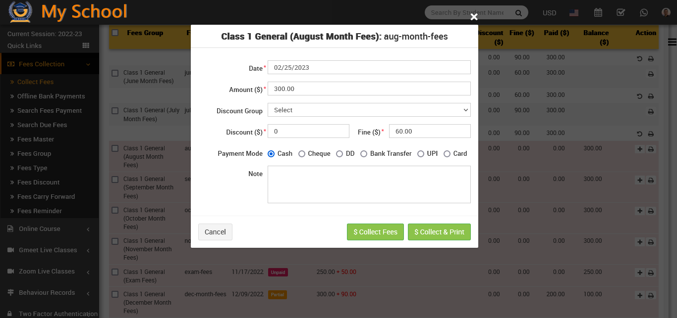 To view fees detail click on Collect Fees button present at Action column in the student list, at click of this button Student Fees page will be open. Here you can see all assigned student fees details. To collect fees click on Add (+) icon present in action column, at click of this icon modal will be open. Fill all the details entries Date, Amount, Discount Group, Discount, Fine, Payment Mode (Cash, Cheque, DD, Bank Transfer, UPI, and Card) and Note (if you have any note) and then click on Collect Fees button.