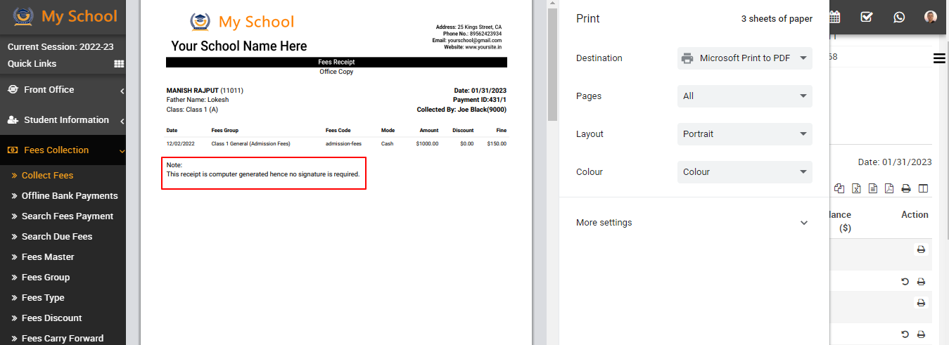 In the receipt, you can see the all details related to fees as well as you can also see the one note that says, "This receipt is computer generated, hence no signature is required