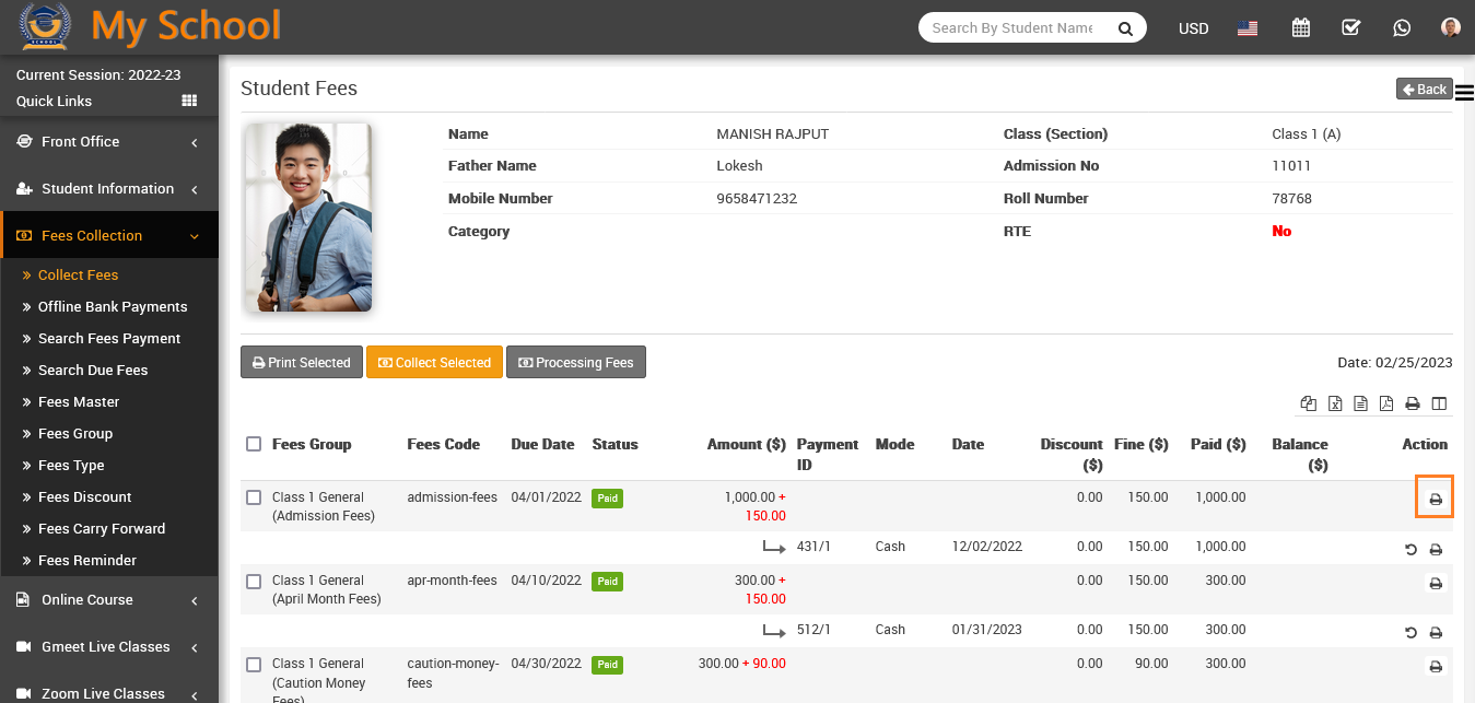 Now to print fees receipt to click on Print button which is showing in Action column
