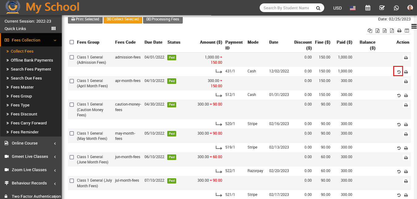 after click on collect fees, so that fees has been collected and you can see fees status as paid in status column.