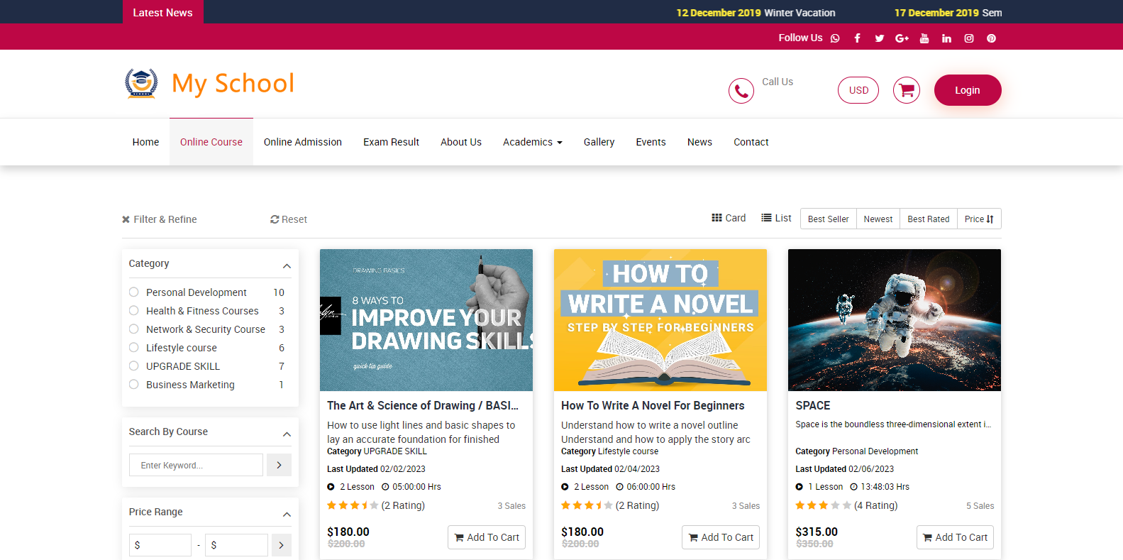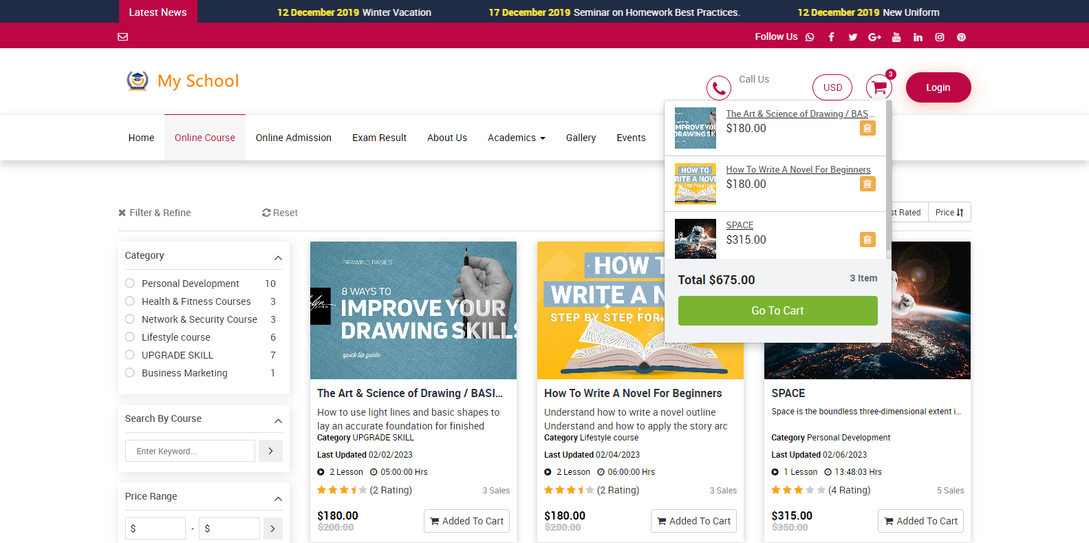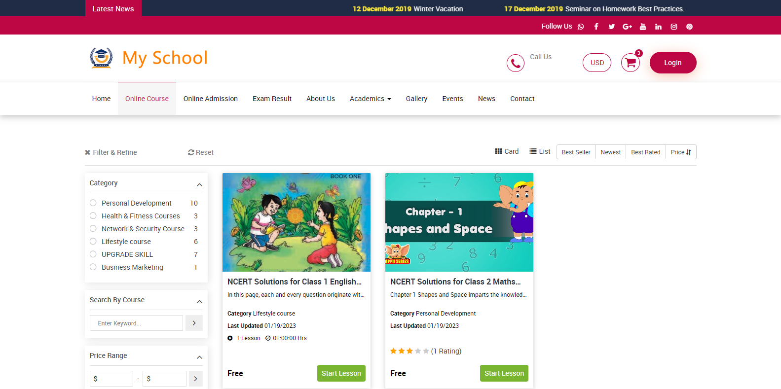 To add a course to your cart, go to the School ERP Software Online Course front page, then click on Online Course.