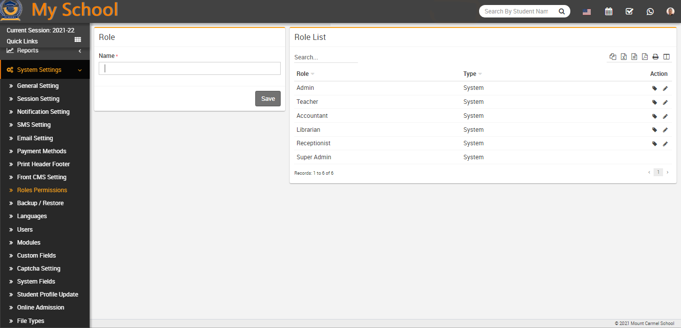 To add roles, go to System Settings > Roles Permission then enter role Name and then click on Save button. You can view this added record in the Role List on the right side of the page.