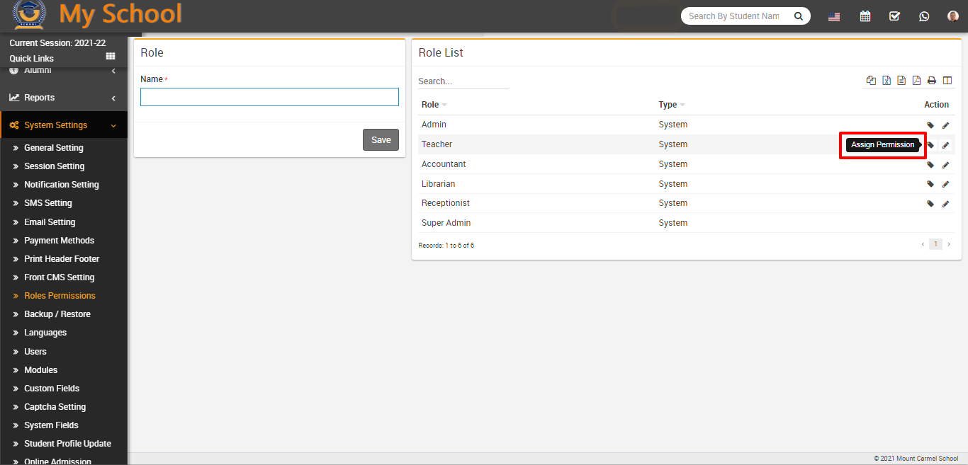 To assign permission click on Assign Permission icon present in role list, at click of this icon Assign Permission page will be open, Here you can assign permission for each module and then click on Save button.