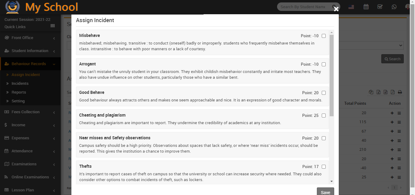Now click on save button which showing in left bottom corner. By click on save button, incident and points are assign to the student.