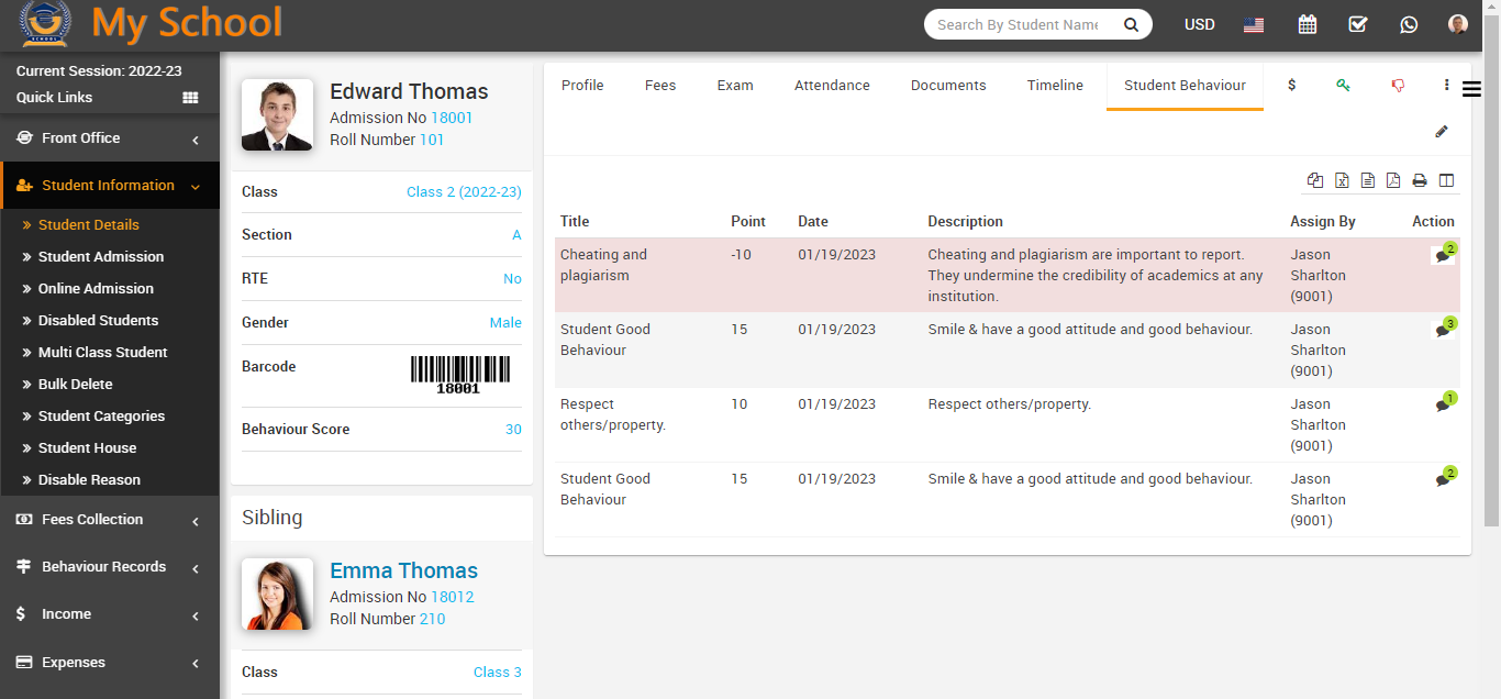 In the incident of student behaviour list showing in the student profile, you can see all the details showing in this table, and now in the action column, you can see the comment option available.