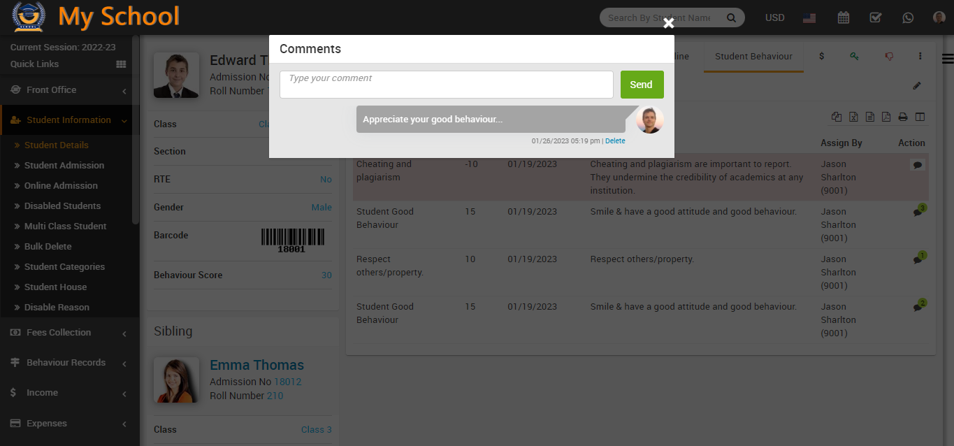 In the student behaviour tab, you can see all the details related to the incident now, in this table, you can see the action column in this action column, you can see the comment option available, and here, students can see the comment on the incident that was left by the superadmin or staff.