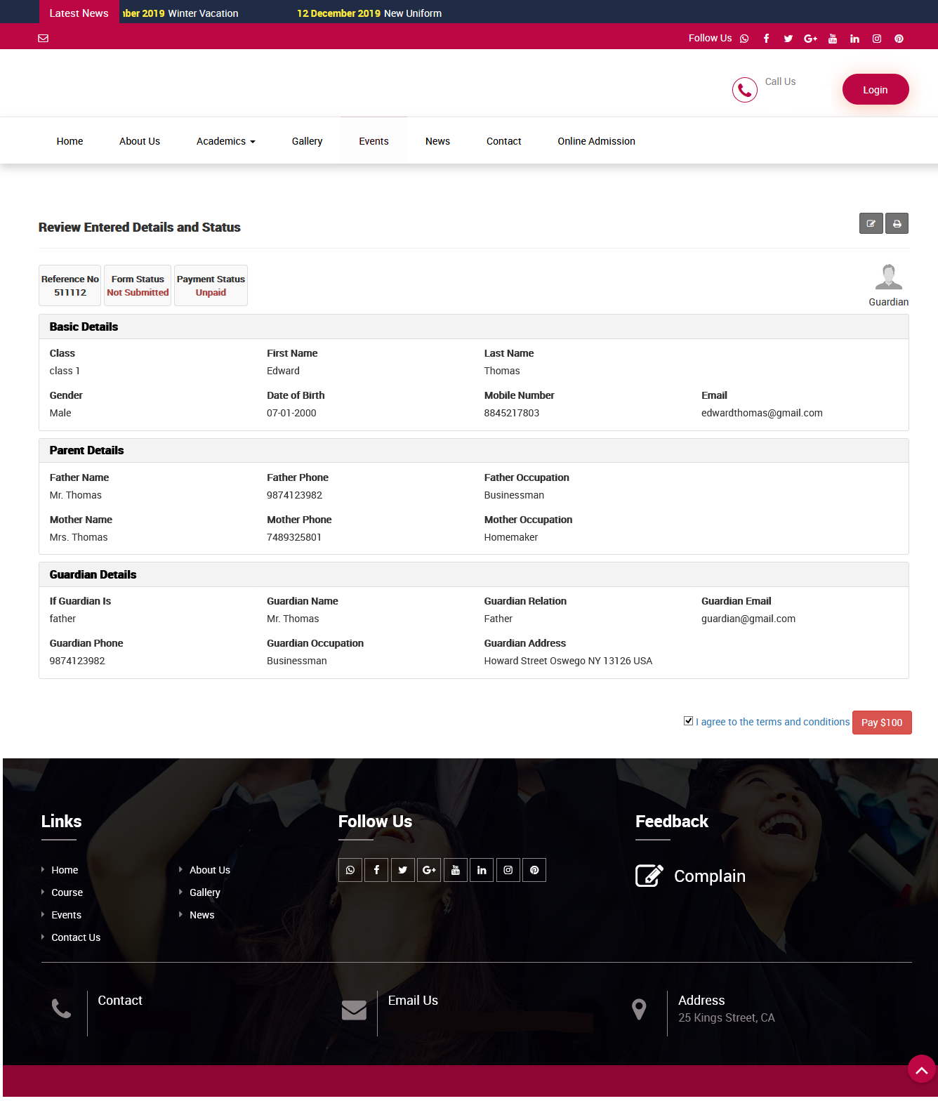 After submitting form, this will redirect you in Online Admission Review Details page where you can check your details what you have filled previously.