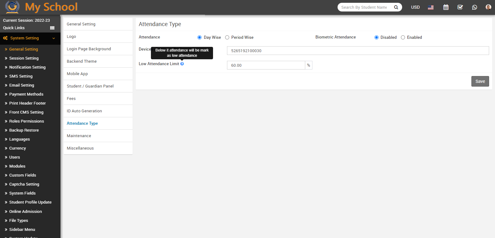 Attendance module workflow: In School ERP Software, we can use two types of attendance (Attendance and Biometric Attendance). You can run any type at time attendance day wise and period wise and attendance type can be select from System Settings > General Settings. In Attendance Type here select the any one attendance type Day Wise or Period Wise and click on Save button.