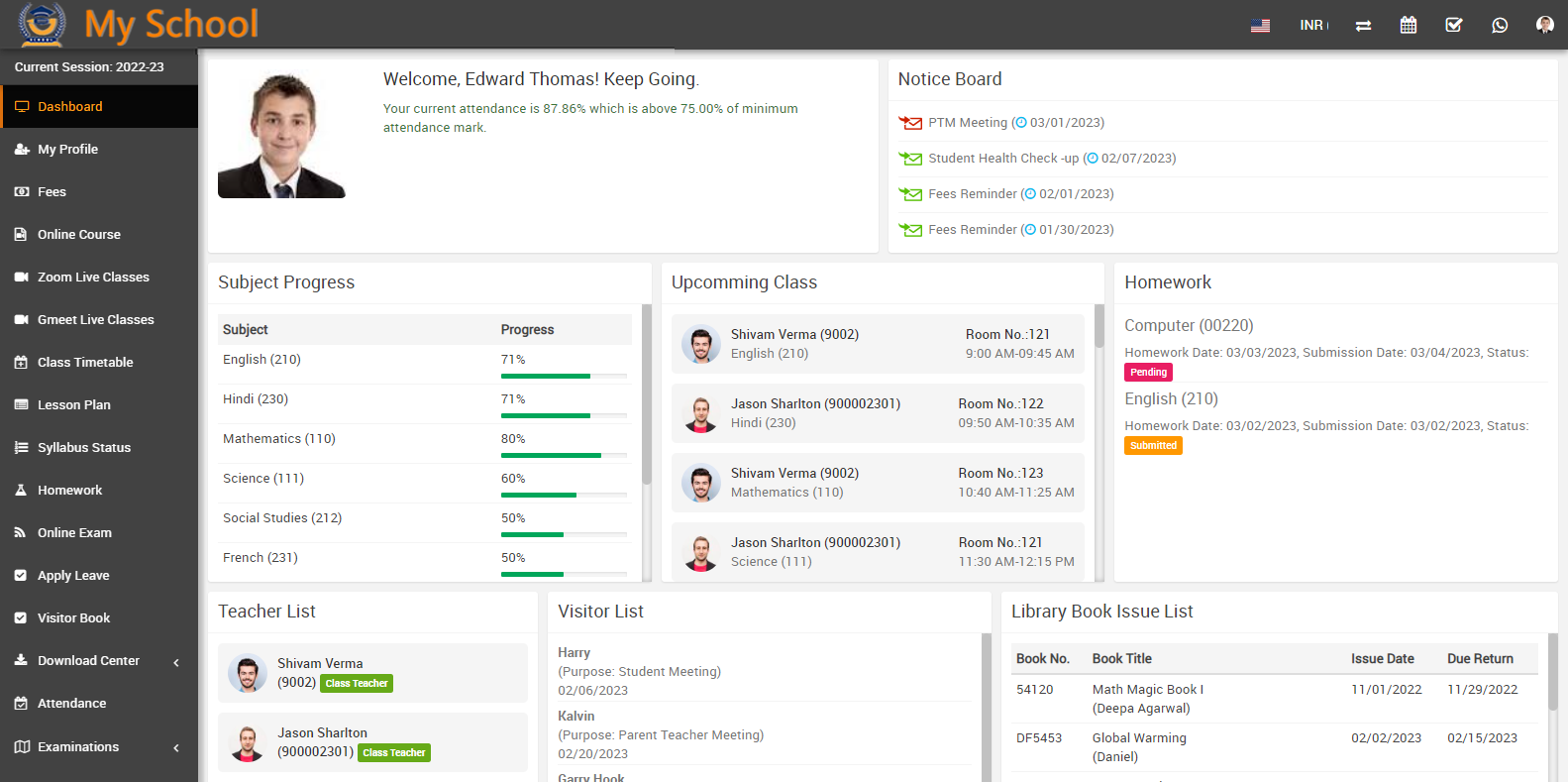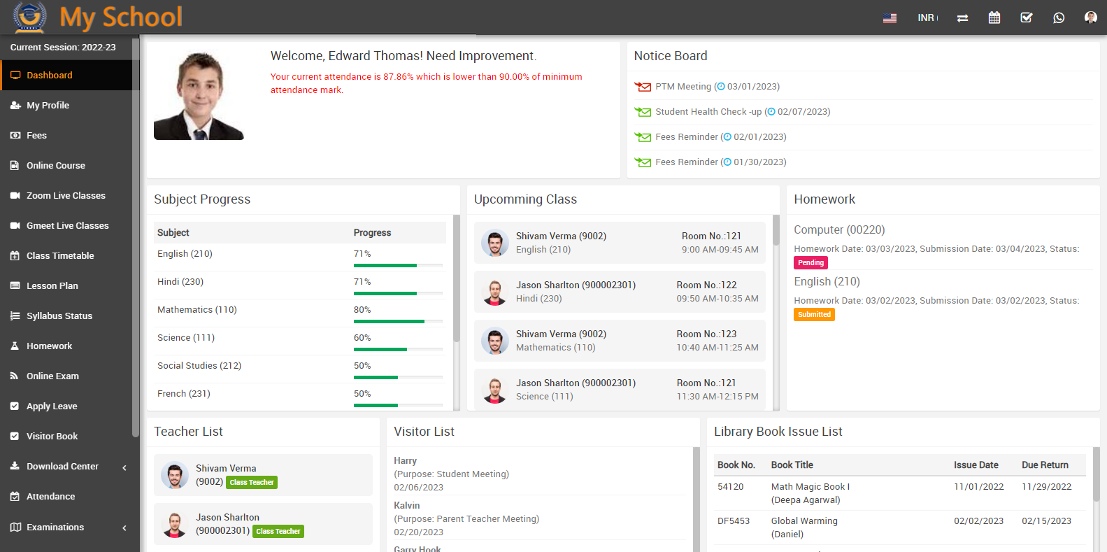 If student get the lower attendance, which is lesser than the low attendance limit so that it will show the red alert message in the dashboard. Which means student attendance is not as per the required attendance.