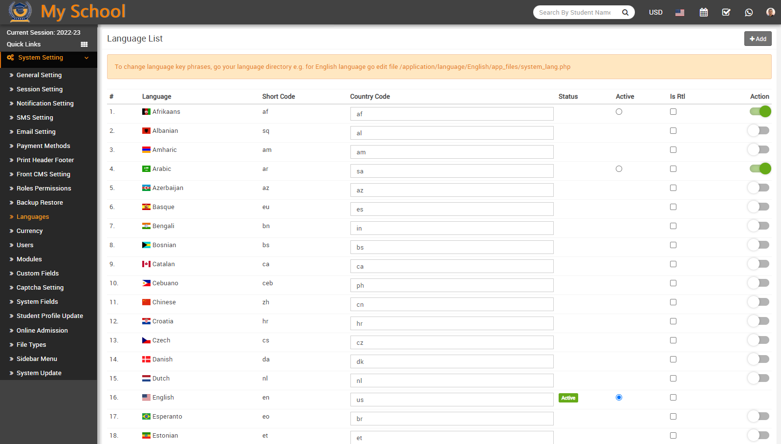 To activate any language (In which you want to run School ERP Software), click on Action button present in the last column.