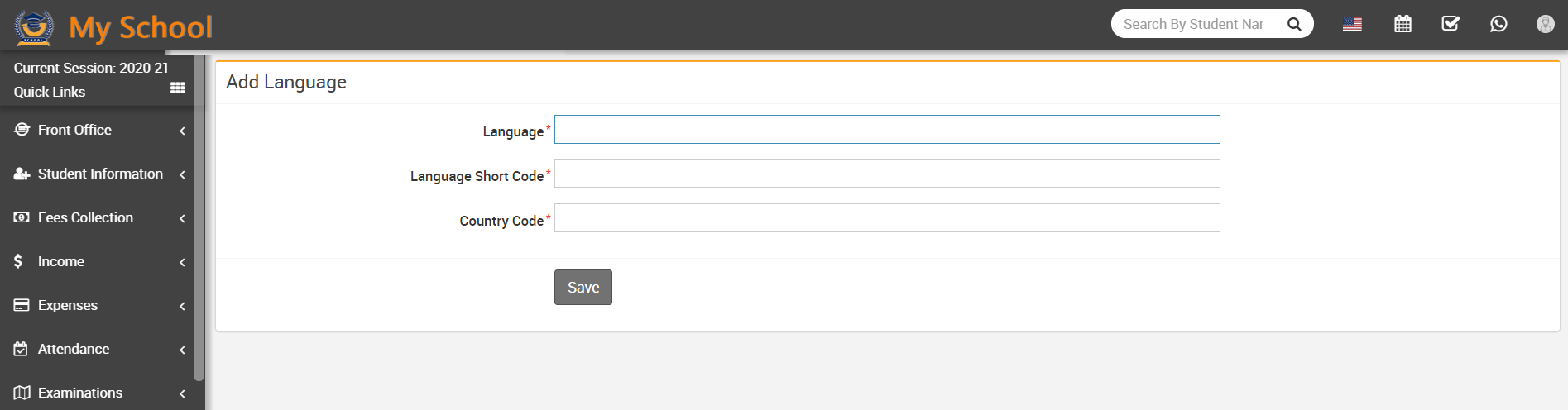After clicking of this button Add Language modal will be open. Here enter Language, Language Short Code, Country Code and then click on Save button.