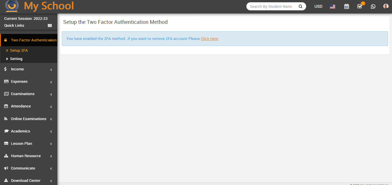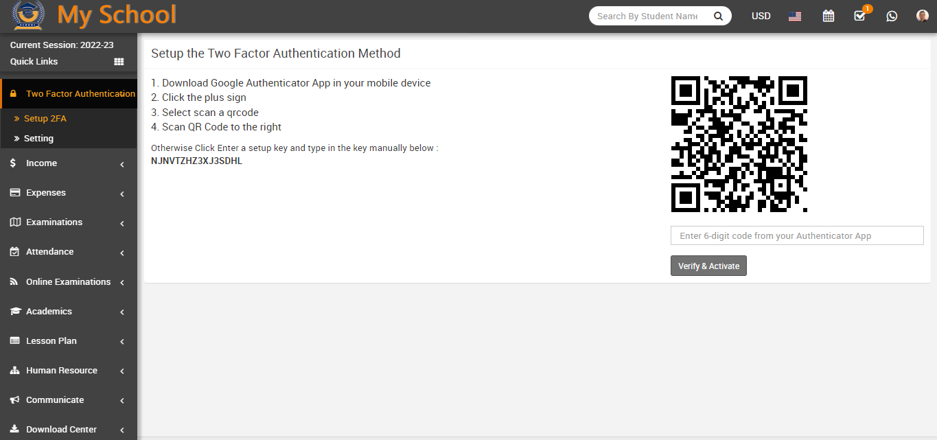 Now open the your School ERP Software, go to Two Factor Authentication > Setup 2FA and fill the six digit verification code which is showing in your mobile device in right below of QR code and click on Verify & Activate.
