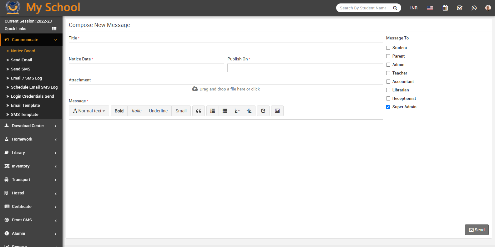 here enter the details message Title, Message, Notice Date and Publish on, attachment file, Message To (Select those you want to message) and then click on Save button.