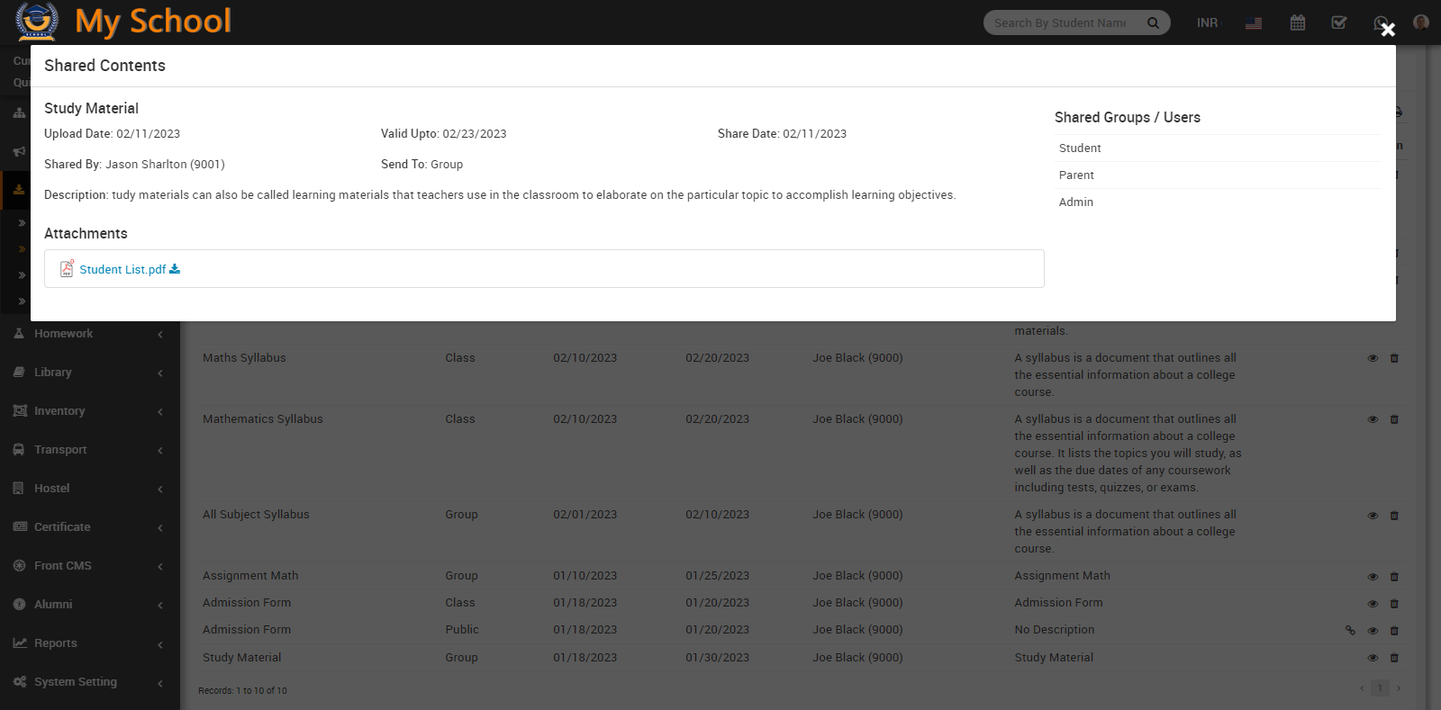 Clicking on the View icon will open the Shared Contents model. In this model, you can view details of the shared content such as the Upload Date, Valid Upto, Share Date, Shared By, send to, Description, and Shared Group/Users. In the Attachments section, you can view or download the attachment file by clicking on it, depending on the file type.