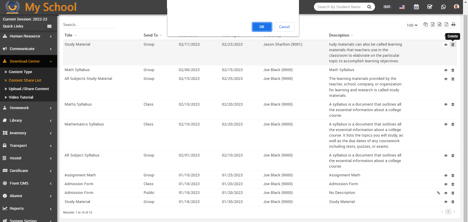 To Delete a content detail from the shared content list, simply click on the Delete icon located in the Action column. This will open a Confirmation model. Click the "OK" button to confirm the delete of the content details from the content share list.