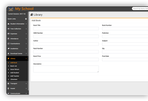 Manage books with complete books inventory including details like ISBN, author, publisher, rack number, quantity, price, postdate etc