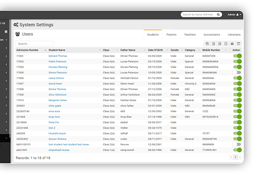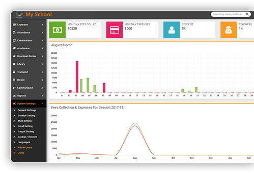 6 User's roles Admin, Accountant, Teacher, Librarian, Parent & Student for their different functionalities