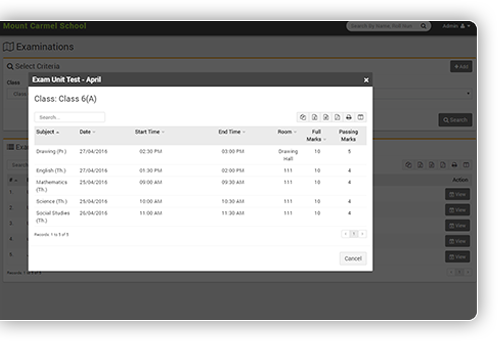 Schedule exams with start/end time, exam room, full marks and passing marks