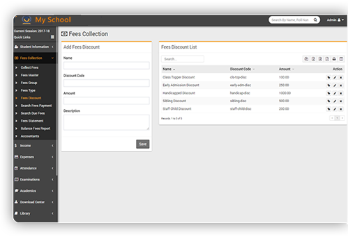 Create fees discount like staff child, sibling discount early admission discount etc