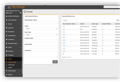 Manage school hostel, hostel rooms with room types