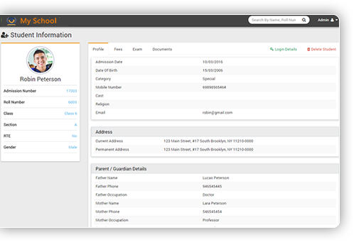 Powerful student admission form add 40+ records for student including previous school details. Add student siblings, RTE, IDs and multipledocuments to maintain complete record in student profile